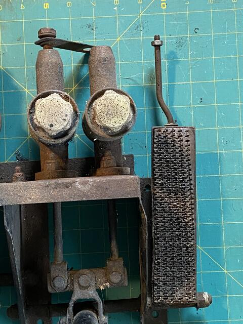 The bell crank assembly is mounted to the firewall above the rod attached to the pedal which is screwed into the short arm. Pushing the pedal raises the long link attached to the throttle.